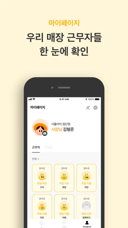 - 모든 근무자의 근태는 마이페이지에서 확인 가능해요.
