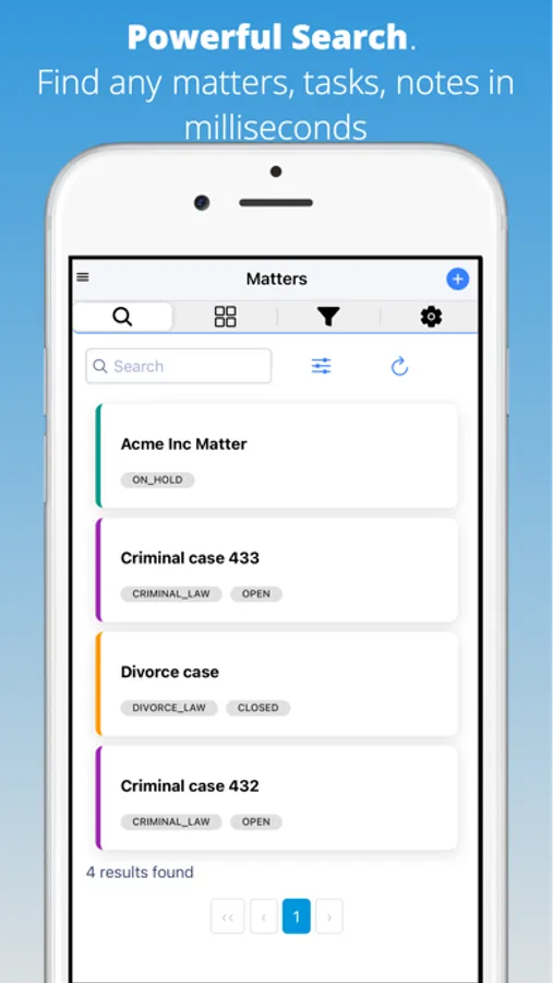 Power faceted search so you can easily find any matter, client or a file in the blink of an eye at blazing fast speed.