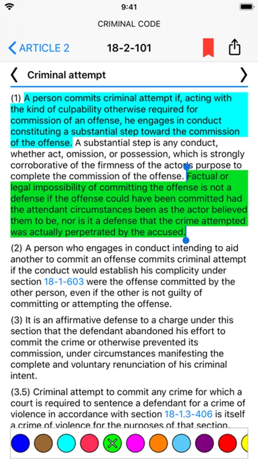 • Highlight any portion of statutory text for easier reference, to make studying easier, or to visually group related topical material, just like you can do in the dead-tree "Blue Book".