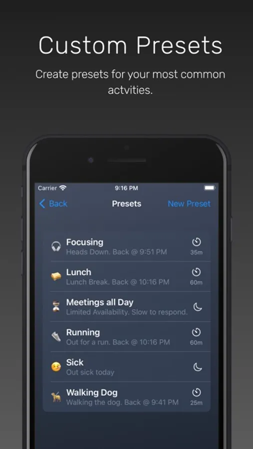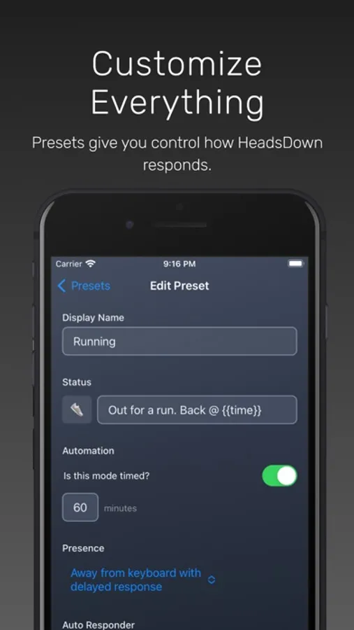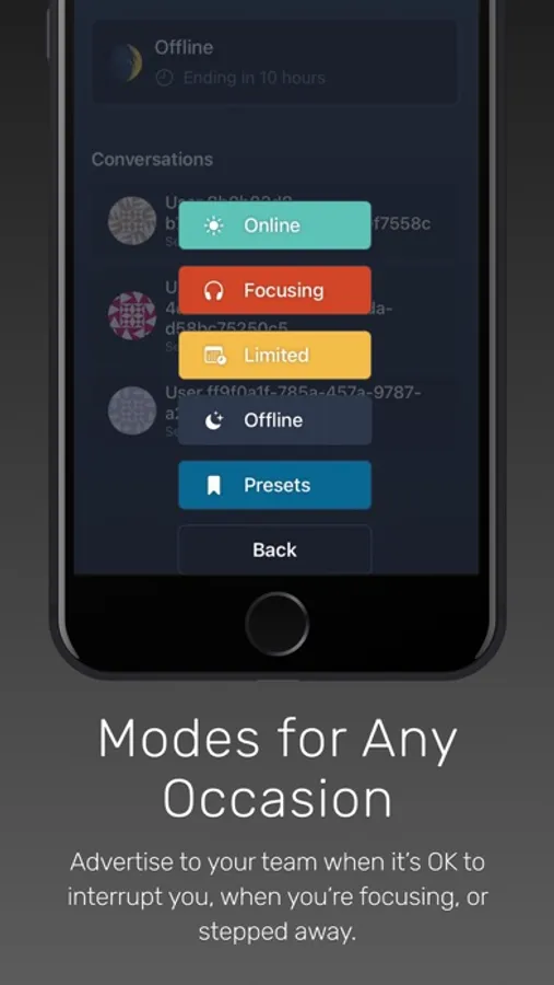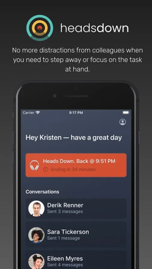 No more distractions from colleagues when you need to step away or focus on the task at hand. HeadsDown handles those inbound interruptions, allowing you the freedom to accomplish your goals. HeadsDown integrates with your existing Slack account. Configure workday automation and HeadsDown will set you online at the start of your day and offline so you can leave work on time.