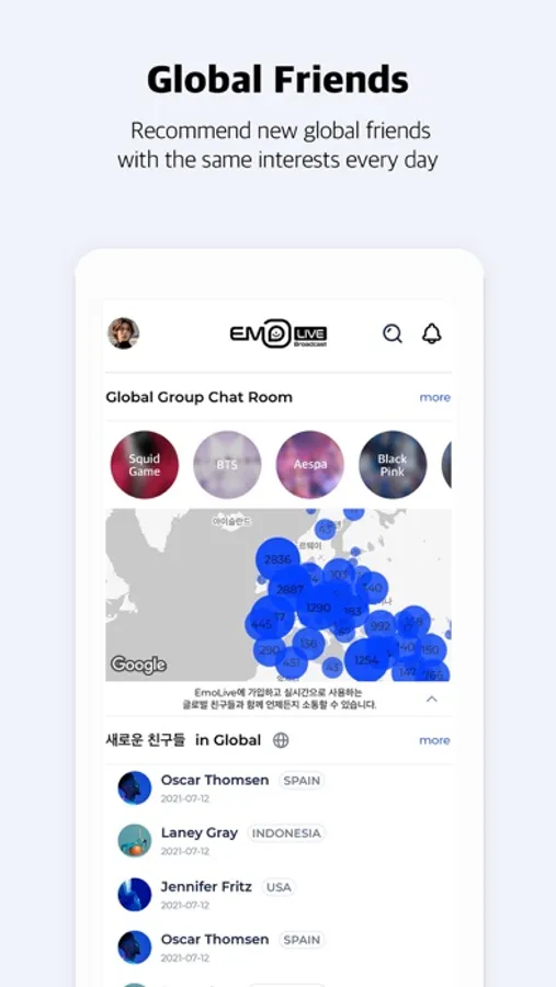 emoLive is automatically translated so that users with different languages can communicate with each other in real time in the service area of chatting, video call, and live broadcasting.