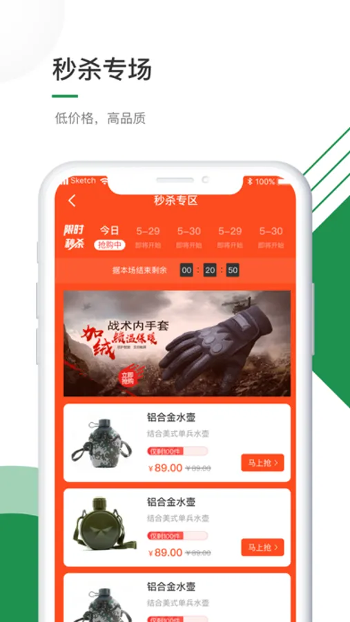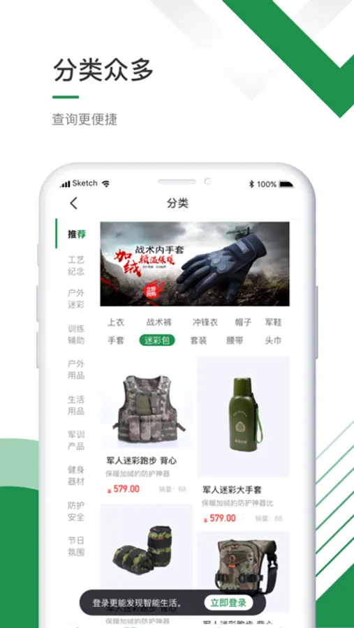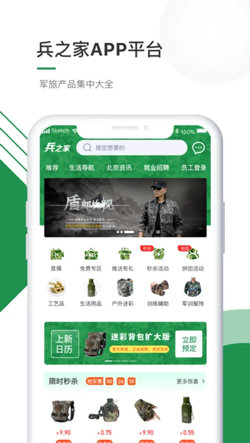 以军工品质品类、户外运动品类、迷彩爱好者、军事爱好者相关品类为核心商品