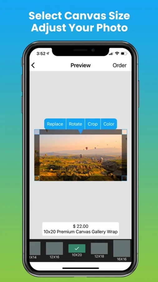 • The App Offers Popular Sizes: 5x7, 6x6, 8x8, 8x10, 8x12, 10x10, 10x20, 12x12, 12x36, 11x14, 12x16, 16x16, 16x20, 16x24, 18x24, 20x20, 20x24, 20x30, 20x60, 24x24, 24x30, 24x36, 30x30, 30x40, 36x36, 32x48 Canvas Prints