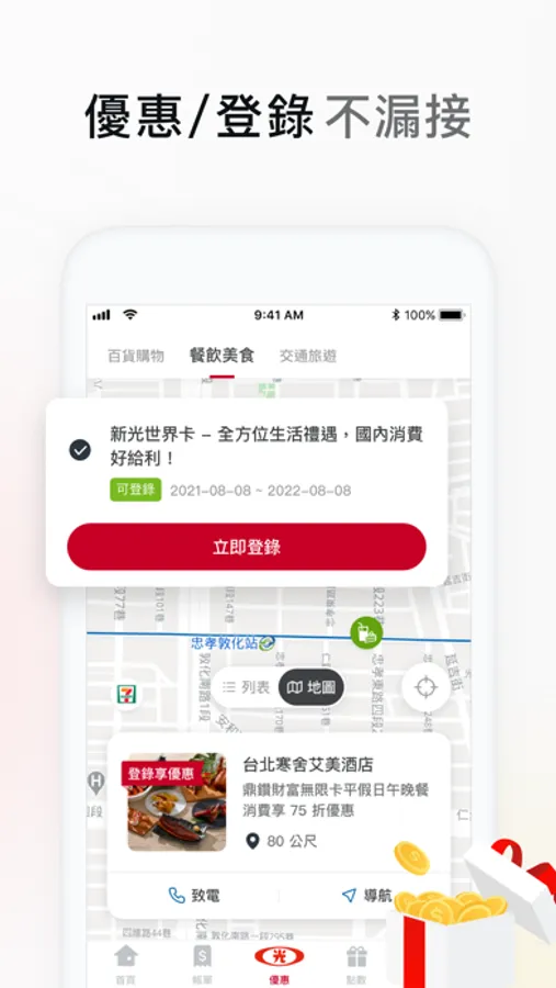 優惠特店輕鬆查找並提供地圖引導在地優惠,查詢優惠活動及活動登錄設定提醒鈴噹,讓您優惠好康不錯過。