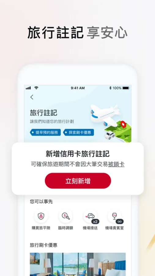 登錄您的旅遊行程,可快速查找優惠訊息,有效使用您的卡片權益,讓您享受旅行、安心出遊、安全用卡。