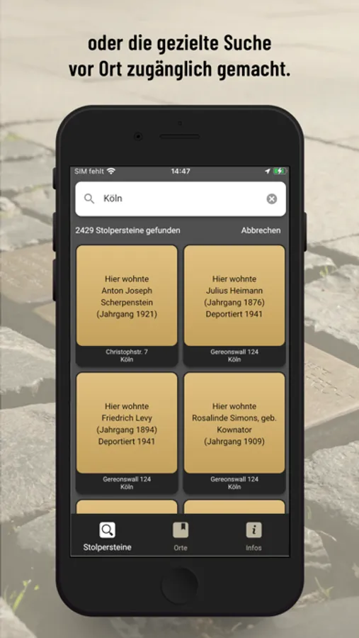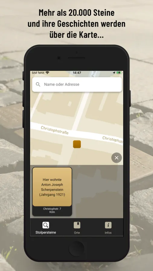 In Verbindung mit dem KunstDenkmal „Stolpersteine“ möchten wir die Erinnerungskultur an die Opfer des Nationalsozialismus digital unterstützen. Dafür verwenden und kompilieren wir öffentlich verfügbare Daten aus der Online-Enzyklopädie Wikipedia und OpenStreetMap. Die persönlichen Geschichten und Schicksale werden so direkt an den Orten in Deutschland zugänglich gemacht, an denen sie geschrieben wurden. 20.000 Stolpersteine waren es bereits bei der Veröffentlichung der App im November 2022. Mittlerweile sind es über 29.000, die regelmäßig von uns ergänzt werden.