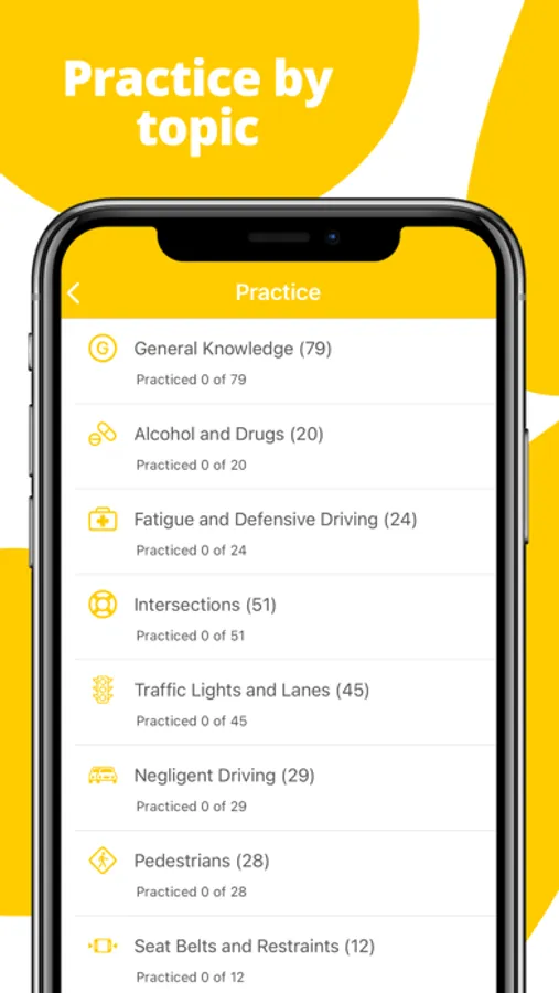 Driver Knowledge Test practice app helps you to practice real exam questions with following features