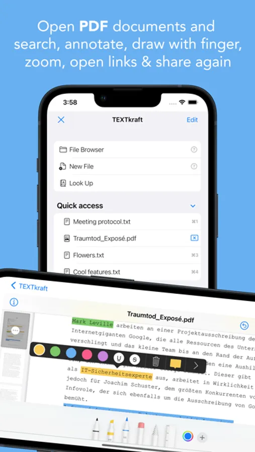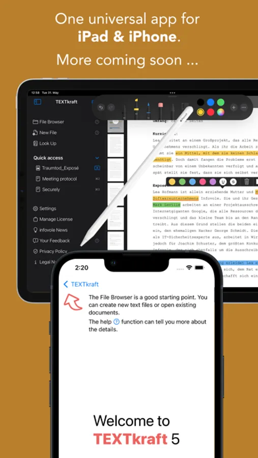 Manage, edit, and encrypt texts, notes, web research, and PDF files. TEXTkraft 5 was redesigned with the user experience from over a decade and optimized for modern devices.