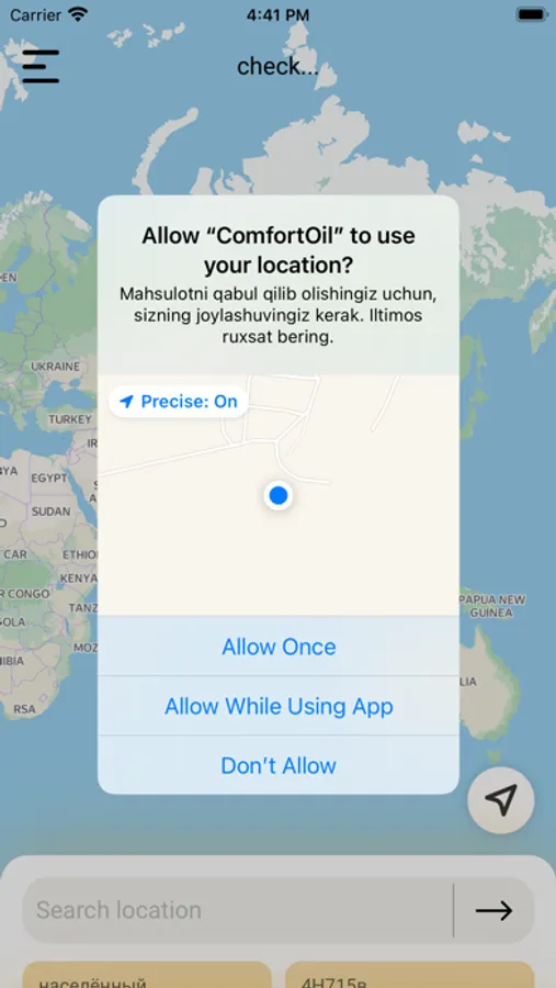 Bu mobil ilova orqali siz avtomobilingiz uchun yoqilg'i buyurtma berishingiz mumkin. Bizni yetkazib beruvchi mashinalarimiz sizni ixtiyoriy tanlagan joyingizga sifatli va arzon narxda yoqilg'i yetkazib beradi. Qulayliklar - bu mobil ilovaga siz doimgi uyingiz, ishxonangiz va ko'plab manzillaringizni kiritishingiz mumkin. Bizni sodiq mijozlarimiz uchun bonuslar taqdim etamiz.