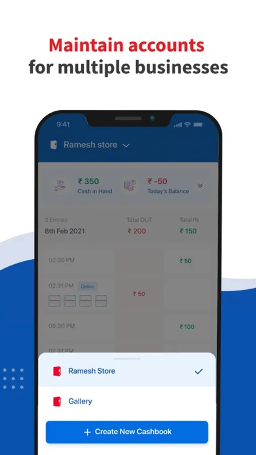 Cashbook is your free digital account book and can be used as a udhar bahi khata. Add transactions daily to record all debit and credit entries of your vyapar / online business.