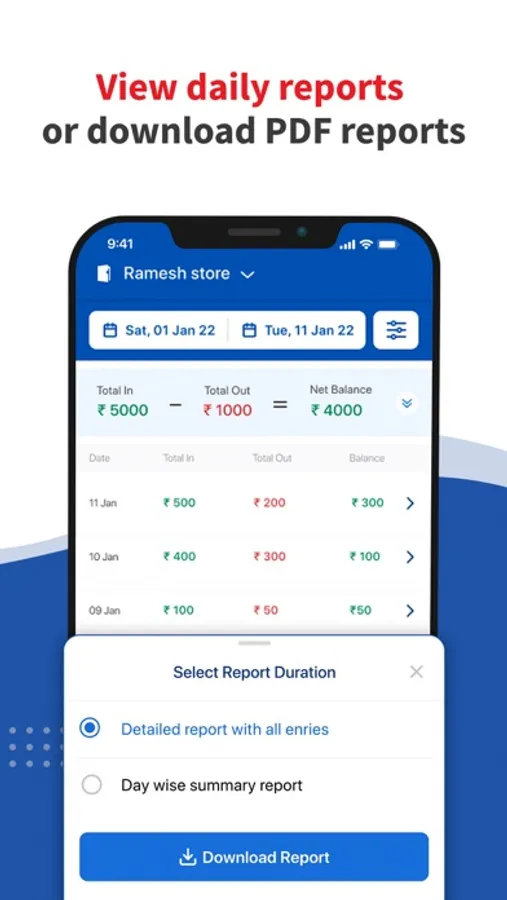 Besides tracking your sales, expenses, and managing galla, this daily Cash Book app also lets you download PDF reports with all entries and day-wise reports. With the Cashbook app it is easier to track your net balance for any duration.