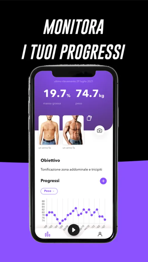 Avrai sempre sotto controllo la tua attività fisica: potrai visualizzare quali esercizi sono previsti nel tuo piano di allenamento, i tuoi progressi e come cambia il tuo fisico nel corso del tempo.