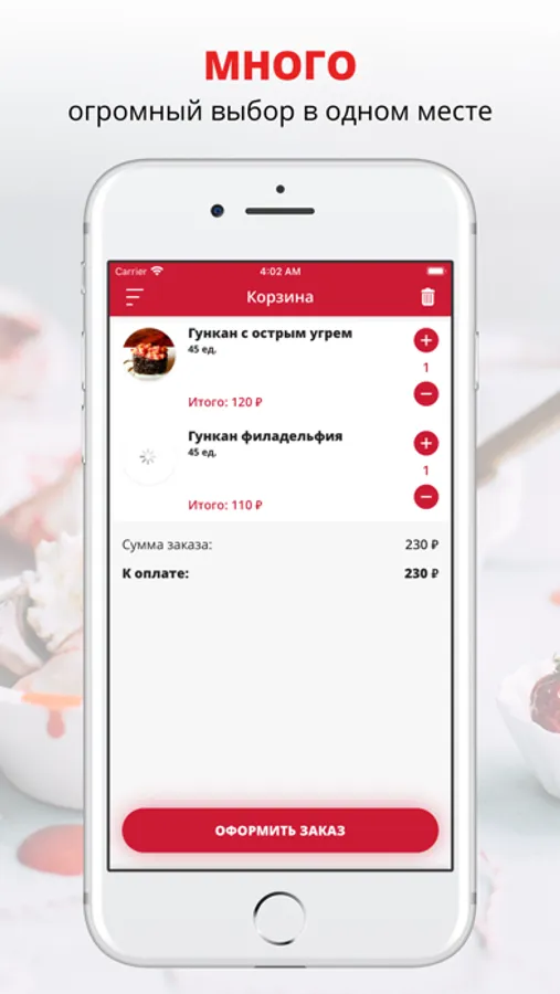 Скачивайте наше приложение, оформляйте заказ и наслаждайтесь любимой едой, где бы Вы ни были! Приятного аппетита!