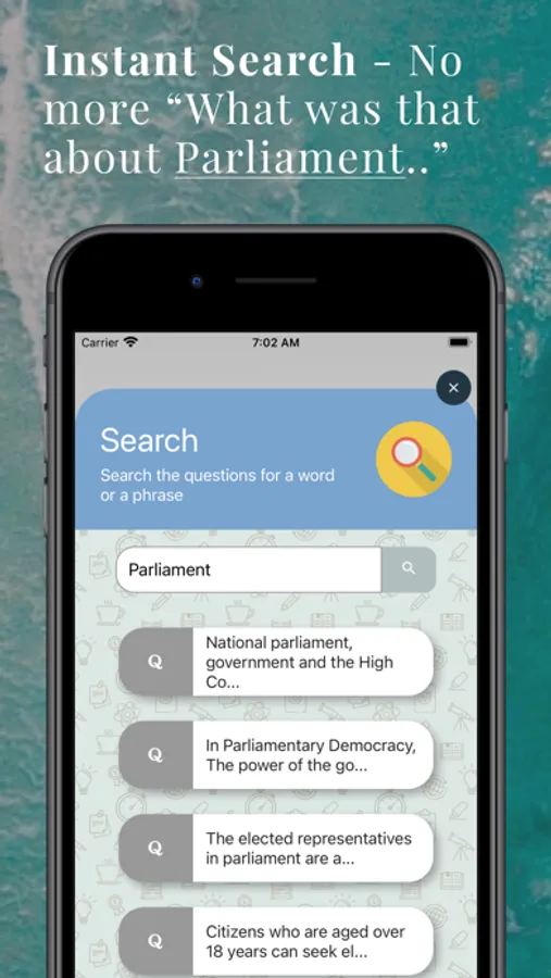 - Exclusive instant search - Type “Parliament” and get all the questions about the Parliament. No more “What was that question about...”.