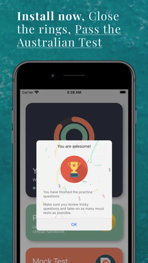 - Exclusive progress meter - Close the rings and we guarantee you will pass your Australian Citizenship Test. It is so simple - Install the app, close the rings, pass the test.
