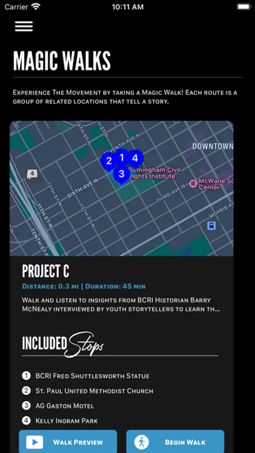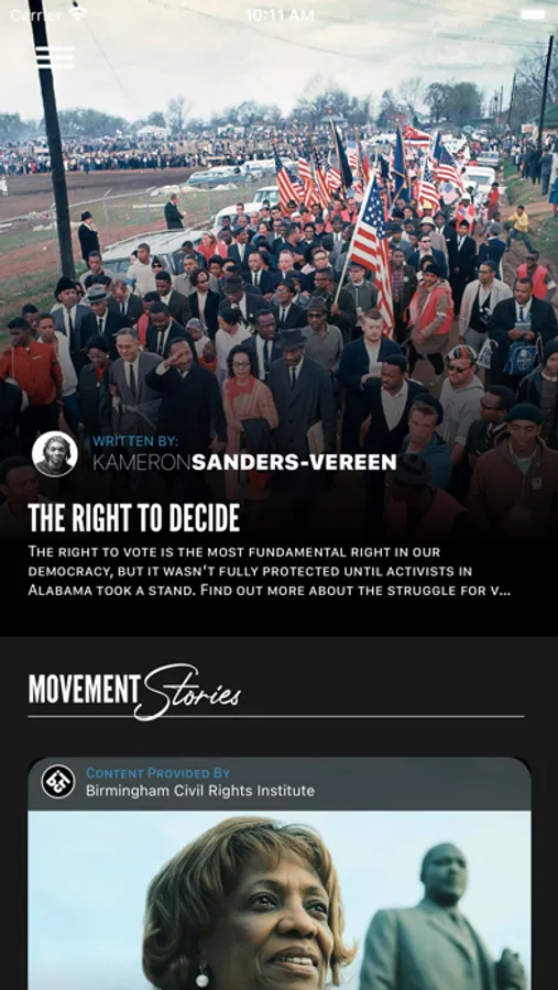 Informed by galleries from the Birmingham Civil Rights Institute (BCRI), The Movement shares Birmingham's history through visual narratives and self guided tours that weave visitors in and out of BCRI, Birmingham’s downtown, and neighborhood landmarks. History has proven that youth, who we call the greatest among us, shape movements and culture. That’s why The Movement features this young generation as budding historians and storytellers and entrusts them the tools to help guide and create the contents of the app with the hope they they will inspire others to be the leaders of their own movements.