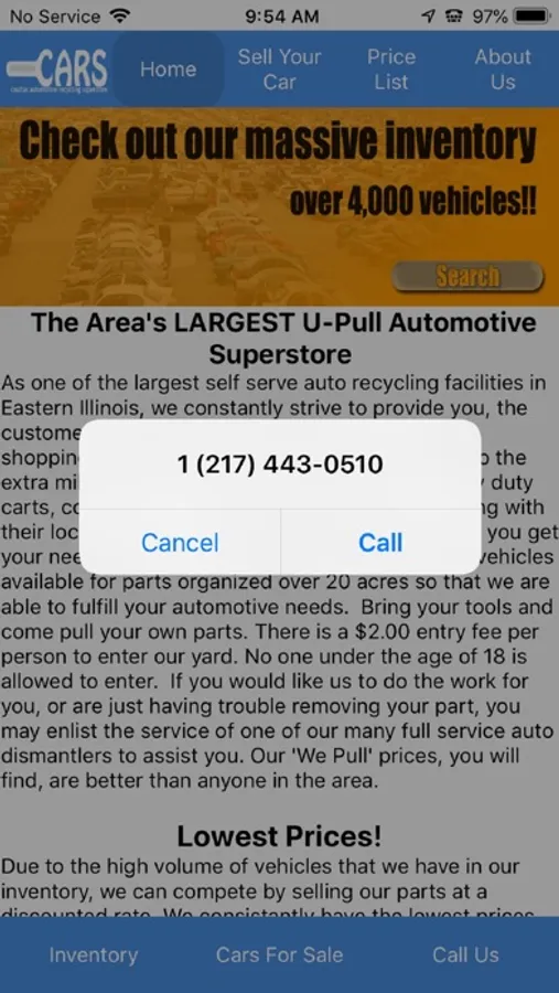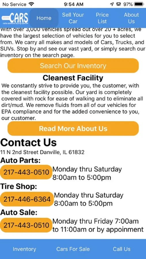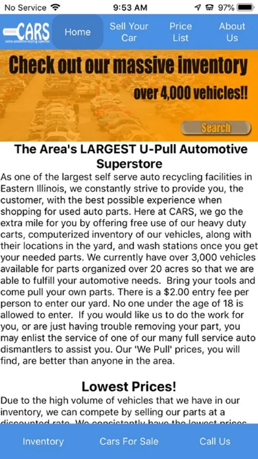 As one of the largest self serve auto recycling facilities in Eastern Illinois, we constantly strive to provide you, the customer, with the best possible experience when shopping for used auto parts. Here at CARS, we go the extra mile for you by offering free use of our heavy duty carts, computerized inventory of our vehicles along with their locations in the yard, and wash stations once you get your needed parts. We currently have over 3,000 vehicles available for parts organized overt 20 acres so that we are able to fulfill your automotive needs.