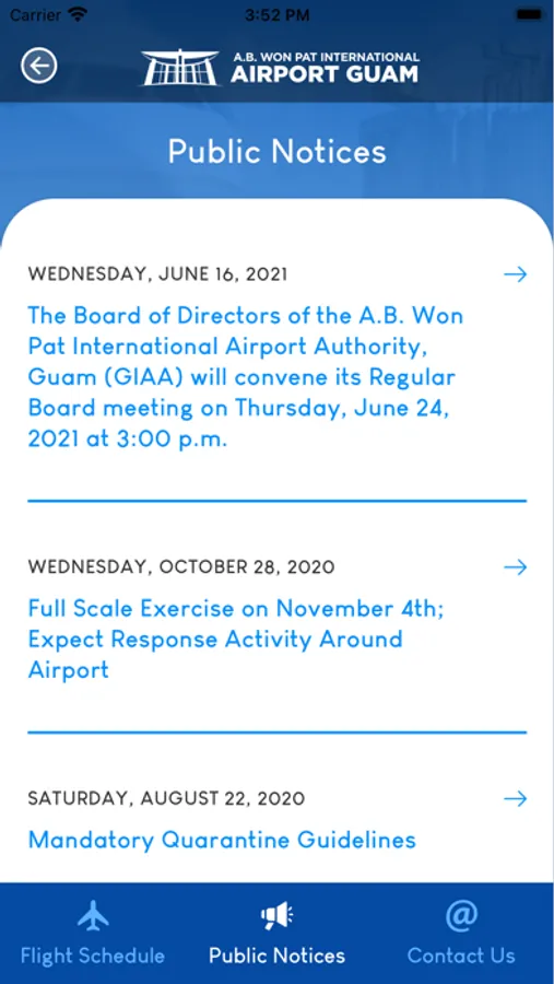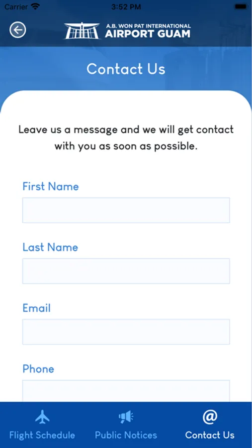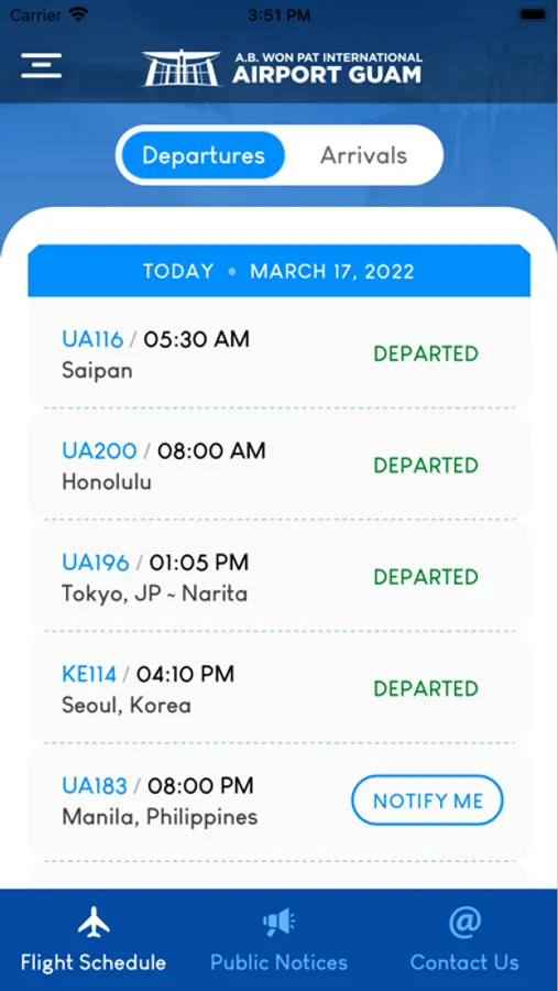 The official Guam International Airport app puts the airport in your pocket, with flight schedule information, public notices and more - everything you need for an easy journey to and through Guam. Whether you're a frequent flyer or a first-time visitor, our mobile app puts the information you need on the move right at your fingertips.