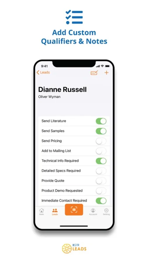 After downloading GTR Leads™ and activating your account, use your device to scan tradeshow badges and quickly follow up with qualified leads from your booth. Add custom notes, voice or video recordings, and sales qualifiers prior to uploading to your preferred CRM. Download leads directly through the app or online. No hardware is necessary.
