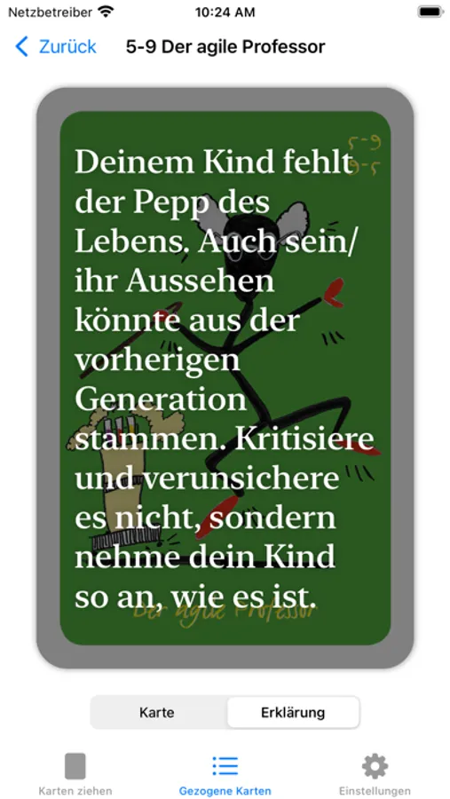 Du stellst dir eine Frage zu deinem Kind, wählst dir eine Karte aus und tippst auf sie. Die ausgewählte Karte deckt sich auf und du kannst zwischen Kartenbild und Erklärung wechseln. Du kannst mehrere Karten in einem Spiel hintereinander ziehen, sowie die App auch täglich nutzen.