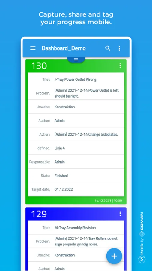 The app for digital project tracking! Mobile by COMAN brings together all the issues and tasks of your project in a single place so that all project participants can work with the same information at all times - regardless of your project being a machine, a production plant or a space shuttle.