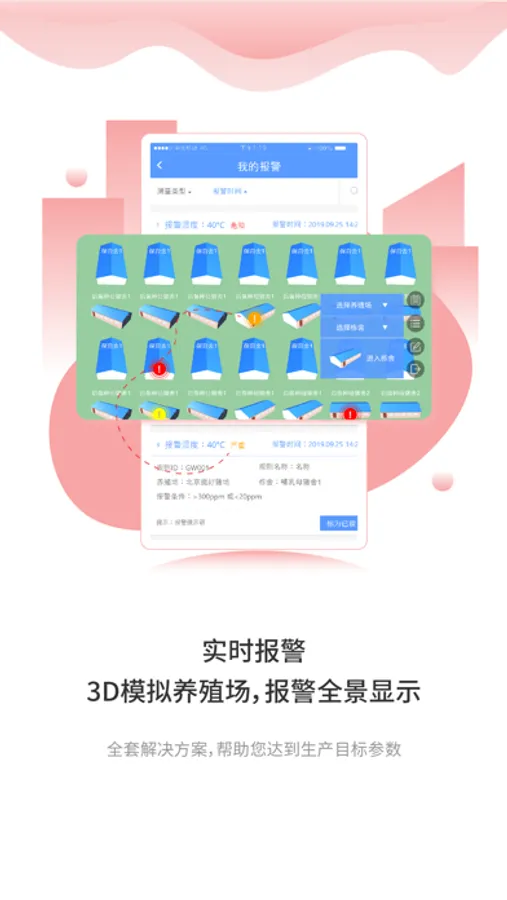 方赞为养殖场可视化管理软件,可以将猪场、鸡场内的设备集成到软件中,统一展示和分析数据。功能包括养殖场管理、用户管理、设备管理、数据报告、报警管理、设置,六大模块。