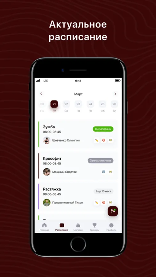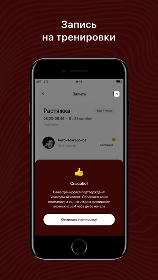 - Получать PUSH-уведомления о предстоящей тренировке за 3 часа;