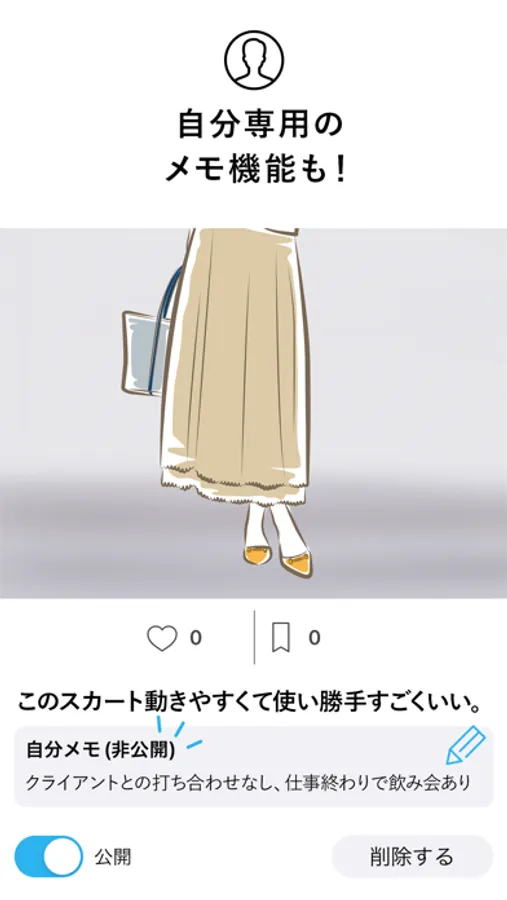 非公開の自分用メモ機能も活用して、自分だけの着回しカレンダーをつくろう。