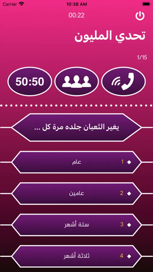 هذه اللعبة صممت على مبدأ لعبة من 15 سؤال و 4 خيارات و 4 وسائل مساعدة ومدة الإجابة علي السؤال هي 25 ثانية ويجب عليك تحصيل اكبر عدد ممكن من الريالات لتنافس أصدقاءك.
