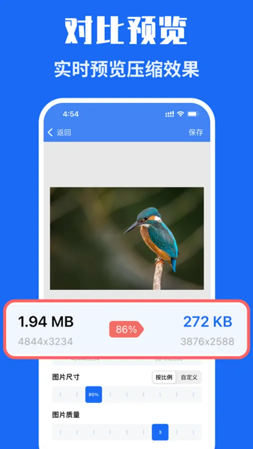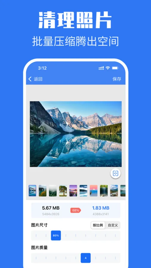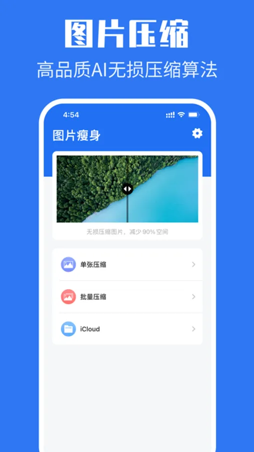 图片压缩 App 是一款专注于图片压缩瘦身的神器,通过AI智能压缩技术,在保持高品质图片画质情况下最高能减少90%的文件大小。