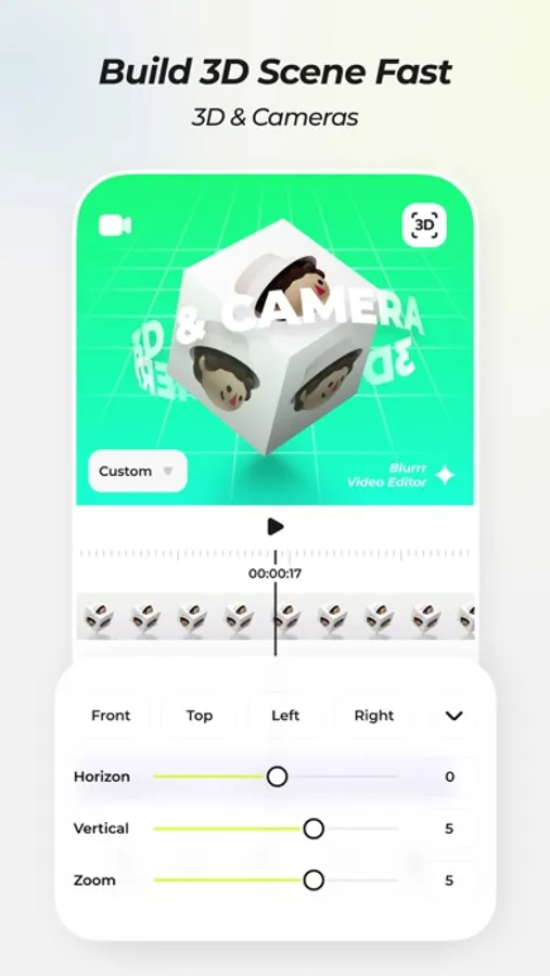 Supports 3D and camera functions, making your video more three-dimensional and interesting. No matter if you are making a 3D tunnel, 3D conveyor belt, 3D cube, or even building VFX, I, Blurrr, can handle it. Use 3D & camera functions to make your creation more realistic and immersive for your audience or fans.