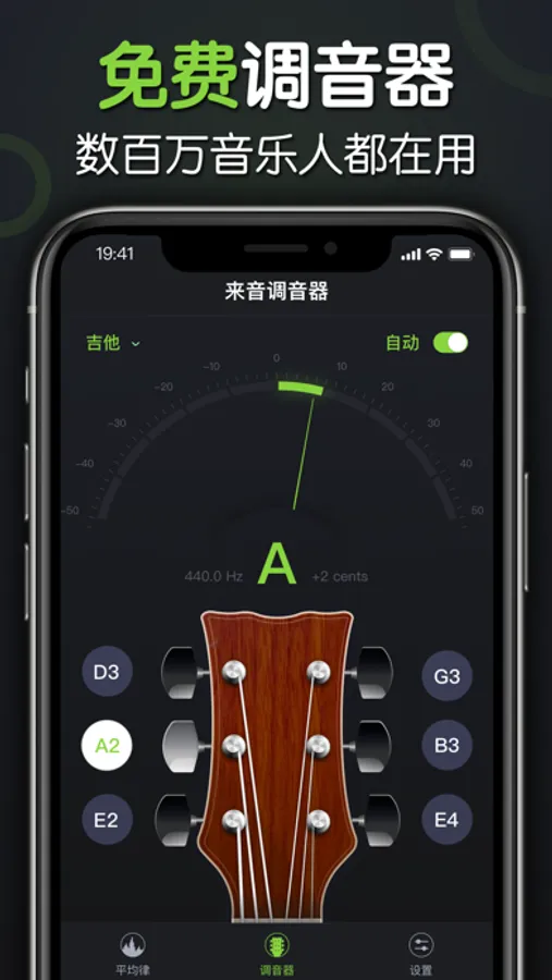 来音调音器,专业级调音设备,比实物调音器调节更精准、高效。支持所有乐器调音,声音识别快速且精准。乐器调音区仿真设计,操作更简单,体验更逼真。