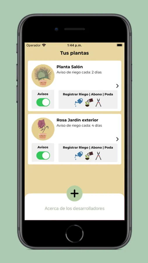 With this app you can configure and program reminder alerts for watering your plants. Select a name for your plant such as "Rosa del Salón" and the frequency of notifications you need. Also record when your plant was watered, fertilized or pruned to keep a clear and simple control.