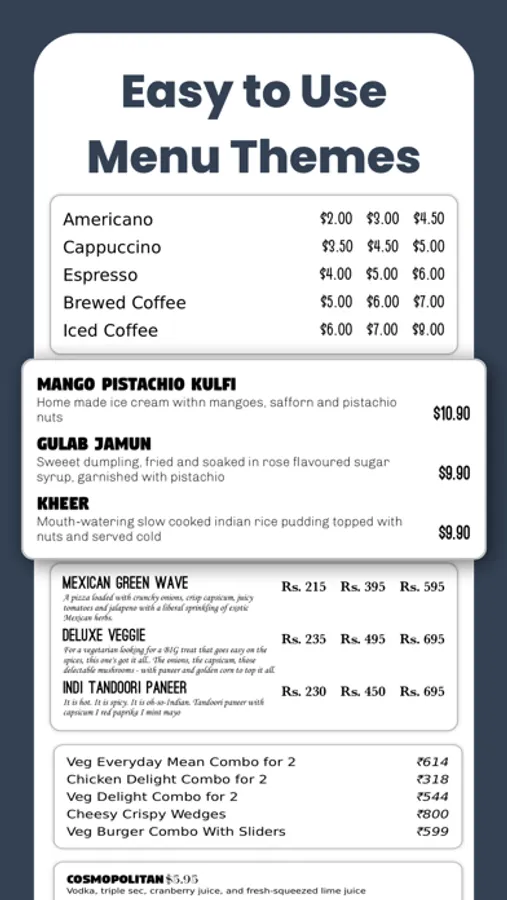 Create a menu for your cafe or restaurant with a menu maker. Customize menu templates. Quick & Easy to Use. No menu card design skills are needed.