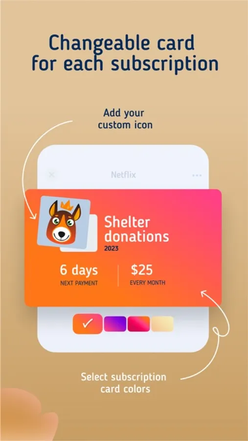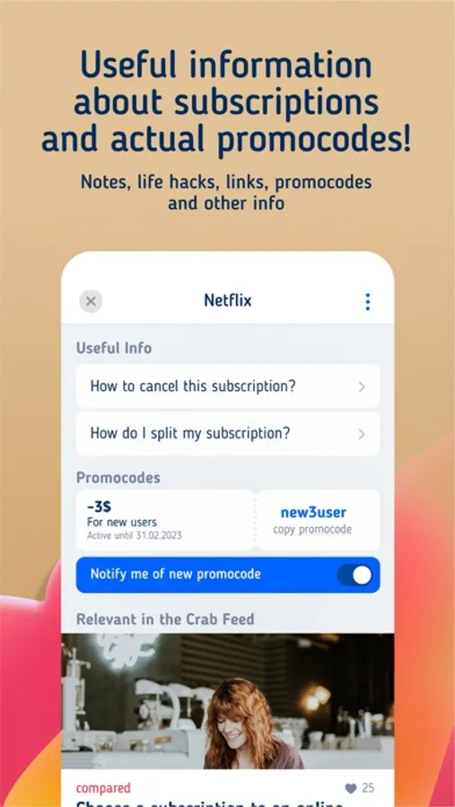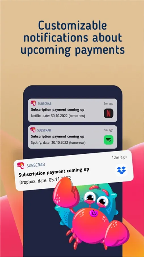 The subscription manager will help you keep track of your monthly and yearly spending. Together with a monthly budget planner, the subscription tracker saves money and time. Track your spending, bills and budget with the tracking app. Warning for every subscription spend. In the subscription currency you specified. Subscription tracker lets you set push notifications for every subscription to give you an opportunity to cancel any service you don't need anymore — directly from the SubsCrab app!