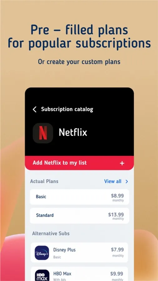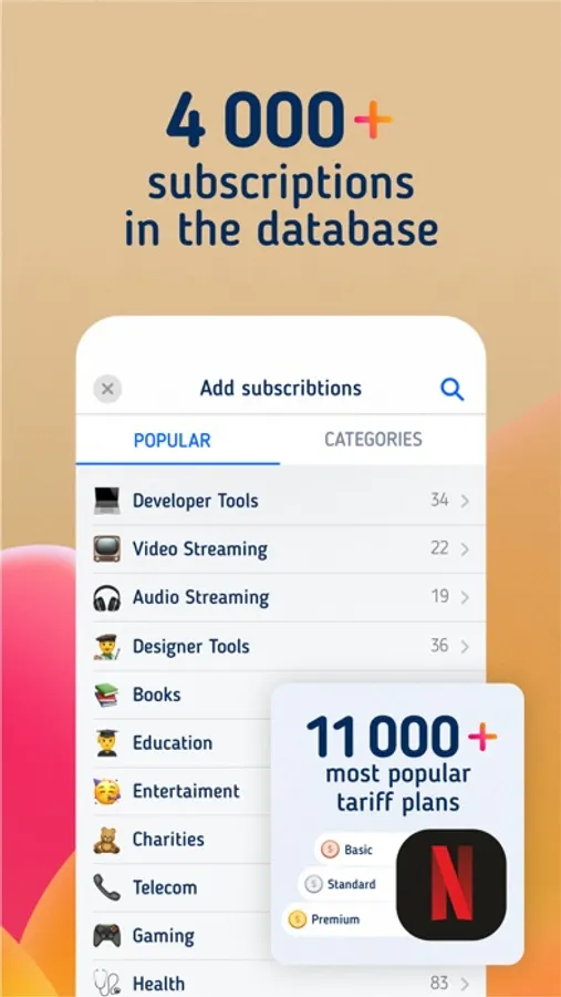 More than 2,000 subscriptions in our catalog and about 600 services with available subscription plans. We prepared a database with available subscription plans for the most popular services. All services are divided into categories for quick searching. If you can't find your subscription or plan, it's possible to make your own one.