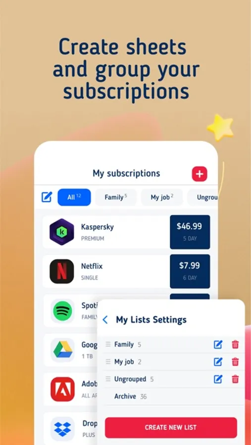 And for those who have a lot of subscriptions with different categories, we have the possibility of dividing subscriptions into lists. Organize all work, family, and archive subscriptions to remember every service you subscribe to.
