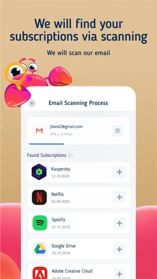If you have a lot of subscriptions, let SubsCrab scan your email or banking transactions to find all the subscriptions you have. Transaction Scan and Email Scan can help you add them easily right to SubsCrab to track to track immediately after adding.