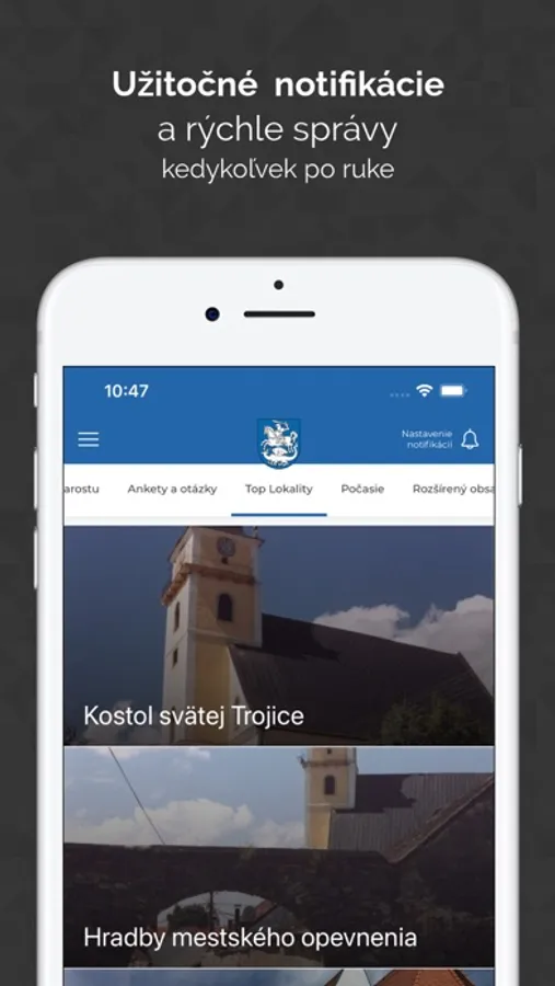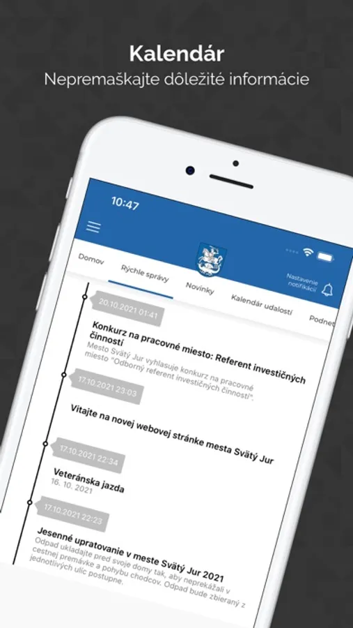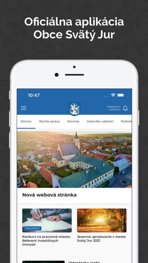 Mobilná aplikácia obce Svätý Jur. V aplikácii nájdete aktuálne informácie z diania v obci, kalendár, dôležité kontakty aj top lokality. Môžete si nastaviť upozornenia na rôzne udalosti, od noviniek, cez udalosti kalendára až po denné sumáre. Obec Vám v prípade kritickej situácie (napr. povodne) môže poslať upozornenie priamo do aplikácie.