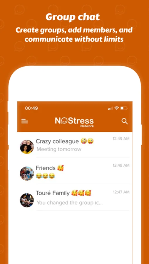 Whether it's with friends, family or colleagues, you can have a great time by creating chat groups in the NoStress Network app. Stay in constant contact with them by chatting or sharing your days in photos or videos.