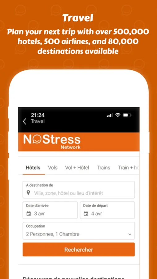Avec l’agence de voyage de NoStress Network, organisez votre prochain voyage en toute sérénité grâce au catalogue contenant plus de 500 000 hôtels, 500 compagnies aériennes et 80 000 destinations disponibles.
