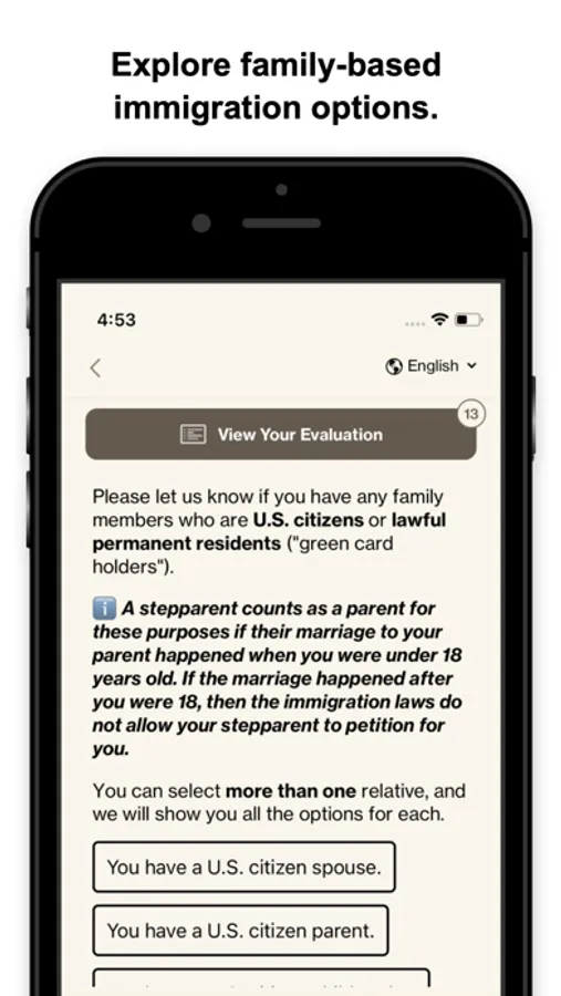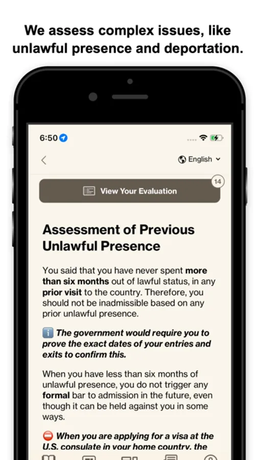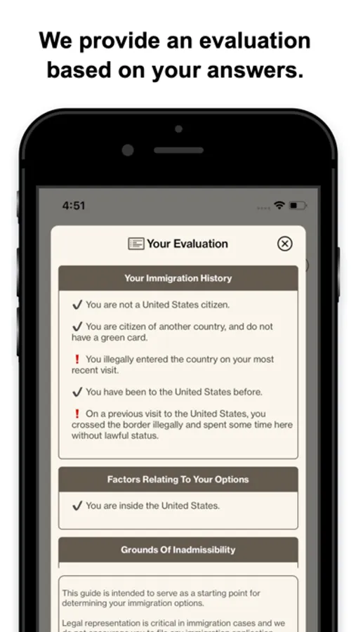 We believe that legal representation is critical in immigration cases, and do not encourage you to file any applications without the assistance of a qualified attorney. Even though we provide personalized information based on your answers, this is not legal advice, and using this app does not make us your attorneys.