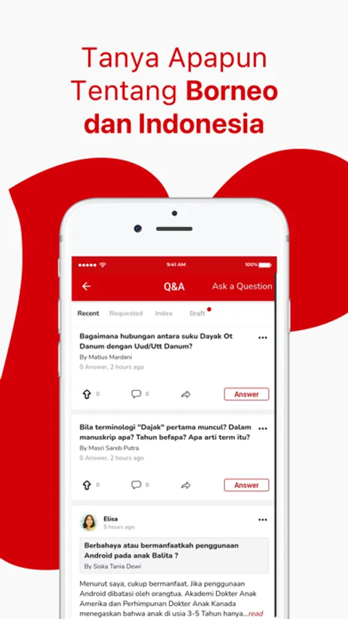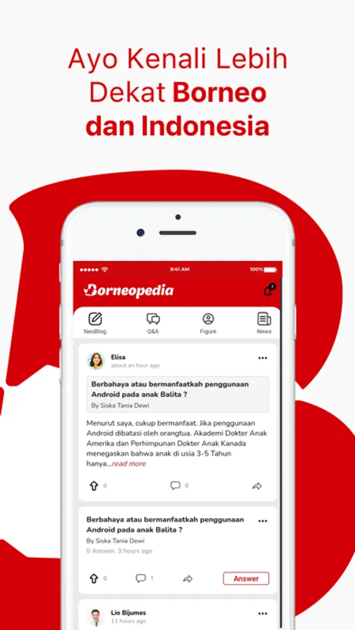Fitur tanya jawab apa saja tentang Kalimantan. Pengguna Borneopedia yang membutuhkan informasi terkait Kalimantan, dapat menanyakan hal tersebut di fitur Q/A (Question/Answer). Borneopedia menyediakan para ahli, tokoh publik, dan pakar lainnya yang siap menjawab pertanyaan apa pun tentang Kalimantan. Anda bebas bertanya apa saja tentang Kalimantan, Borneopedia menyediakan jawabannya. Selain itu, Borneopedia juga memberikan kesempatan kepada setiap pengguna untuk berpartisipasi dalam menjawab pertanyaan yang diajukan oleh pengguna lainnya. Dari Anda dan untuk Anda.