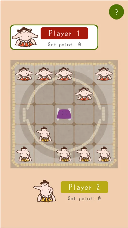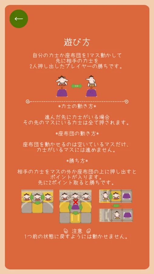 自分の力士か座布団を1マス動かして、先に相手の力士を2人押し出したプレイヤーの勝ちです。