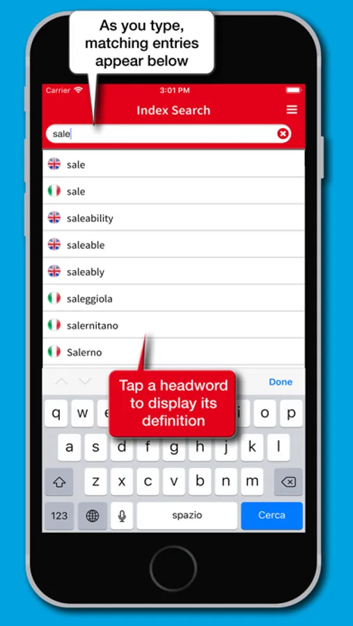 • Index search: displays in alphabetical order the headwords that match the characters typed in the search box