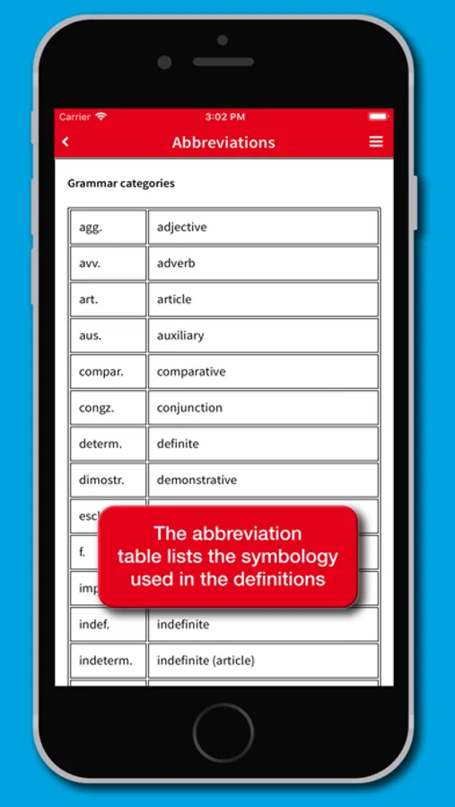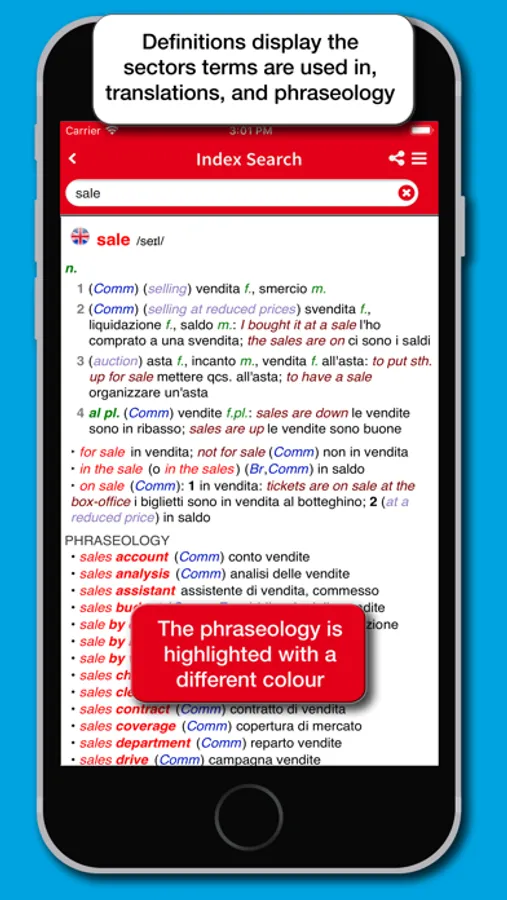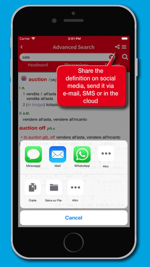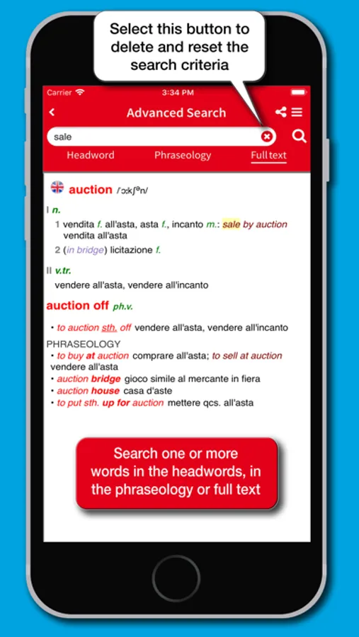 The app's interface provides a simple and intuitive search experience. Each definition can be shared using the features available in the device, such as social media, e-mail, SMS, cloud. A main menu that can be activated via an icon available at the top right of the screen enables all the features of the app: