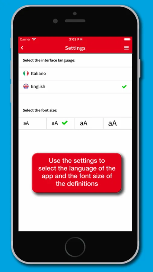 • Settings: allows you to choose the font size of the definitions and the language of the interface