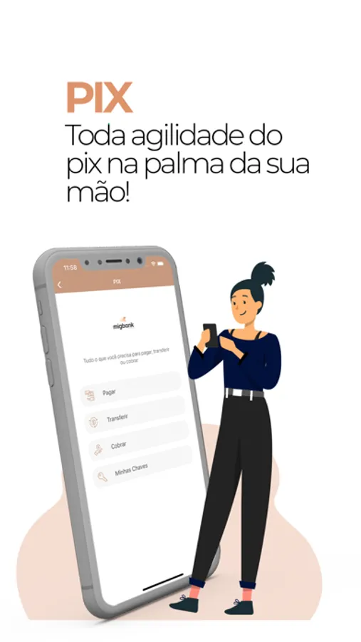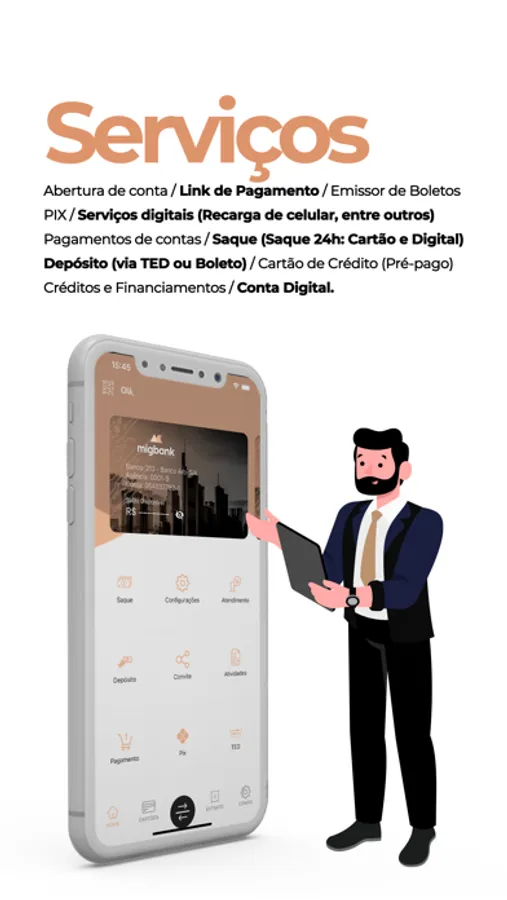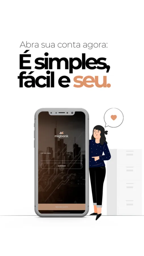 "Abra sua conta digital no Mig Bank. Evoluímos cada vez mais para que você tenha a melhor experiência, O Mig Bank oferece uma conta corrente completa e totalmente gratuita!