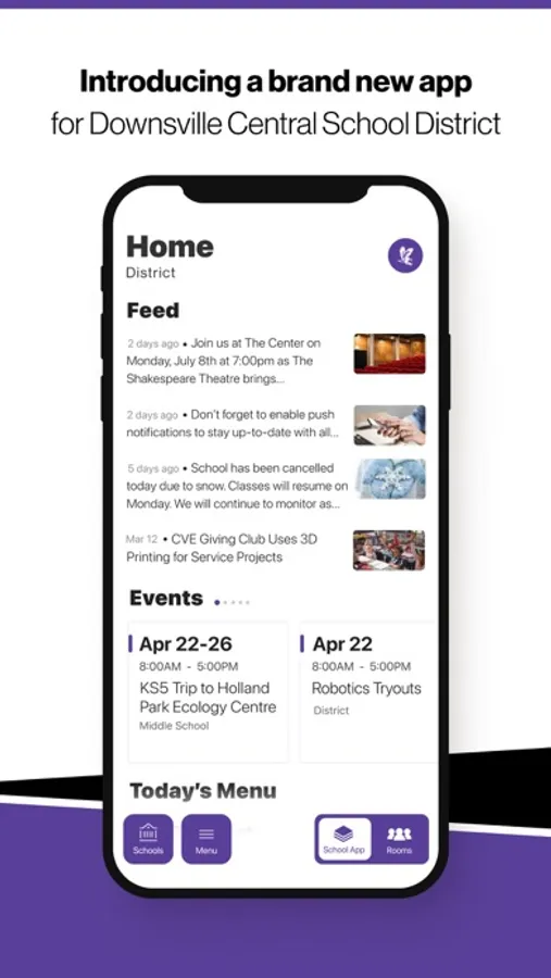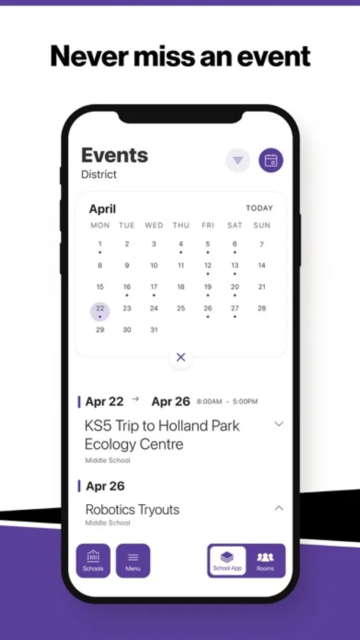 The event section shows a list of events throughout the district. Users can add an event to their calendar to share the event with friends and family with one tap.