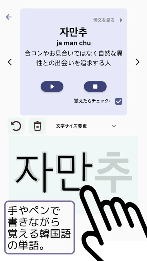 外国語の単語を勉強するのに直接書きながら勉強することが最も重要です。 特に、TOPIKは書取り試験のある韓国語能力試験です。このアプリは、タブレット、スマートフォンの上の指やアップルペンで書きながら単語を覚えられるように開発されました。